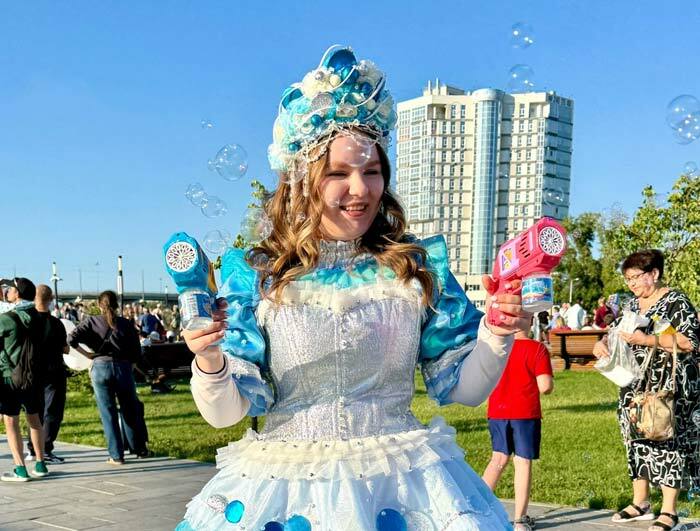 Что входит в программу: профессиональные растворы для пузырей, пена для моделирования, реквизит и оборудование, работа аниматора, интерактивная программа, музыкальное сопровождение.